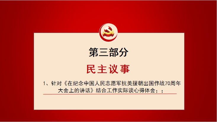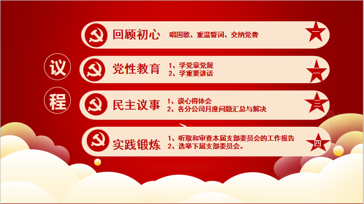 1、回顧初心:內(nèi)容包括唱國歌、重溫入黨誓詞、按月交納黨費(fèi)。