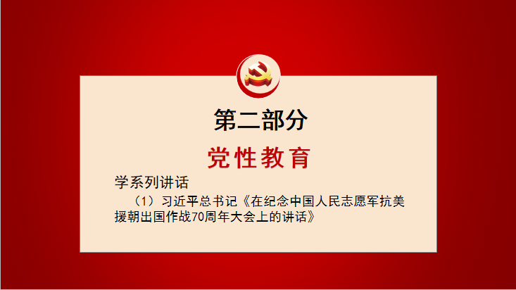 2、黨性教育:學(xué)習(xí)習(xí)近平總書記《在紀(jì)念中國人民志愿軍抗美援朝出國作戰(zhàn)70周年大會上的講話》精神和《中國共產(chǎn)黨第十九屆中央委員會第五次全體會議公報》、《中國共產(chǎn)黨基層組織選舉工作條例》,學(xué)習(xí)10月19日李樂成書記《在全市深化社區(qū)治理改革推進(jìn)會上的講話》精神和《關(guān)于做好全市黨員教育培訓(xùn)工作的實(shí)施方案》(襄辦發(fā)〔2020〕9號)。