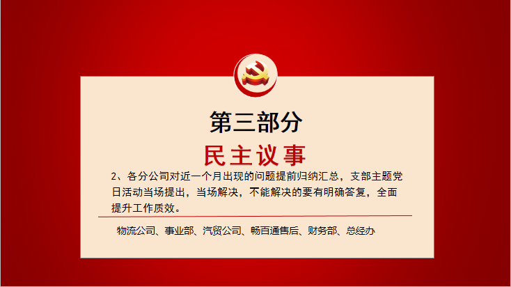 (2)各分公司對近一個月出現(xiàn)的問題提前歸納匯總,支部主題黨日活動當(dāng)場提出,當(dāng)場解決,不能解決的要有明確答復(fù),全面提升工作質(zhì)效。